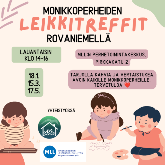 Monikkoperheiden leikkitreffit Rovaniemellä lauantaisin (18.1., 15.3., 15.4. ja 17.5.) klo 14-16....