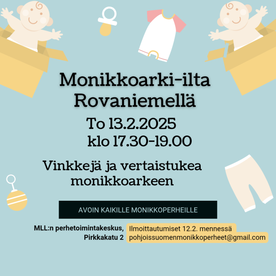 Hei tulevat monikkolasten vanhemmat! Tervetuloa monikkoarki-iltaan to 13.2. klo 17.30-19.00...