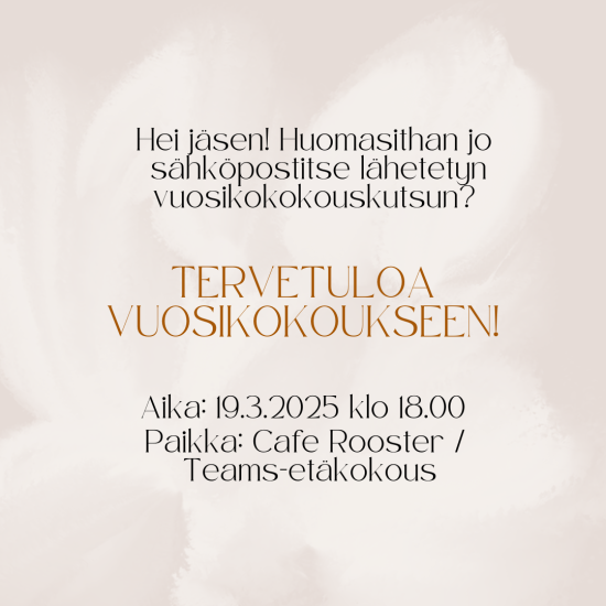 Hei jäsen! ❤️ Huomasithan sähköpostiin saapuneen vuosikokouskutsun? Vuosikokouksessa...