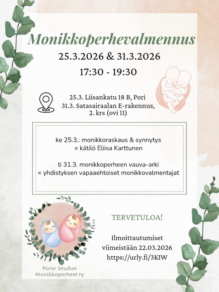 Ti 31.3.2026 klo 17.30-19:30: monikkoperheen vauva-arki – yhdistyksen vapaaehtoiset monikkovalmentajat (Satasairaalan E-rakennus, 2 krs., ovi 11)