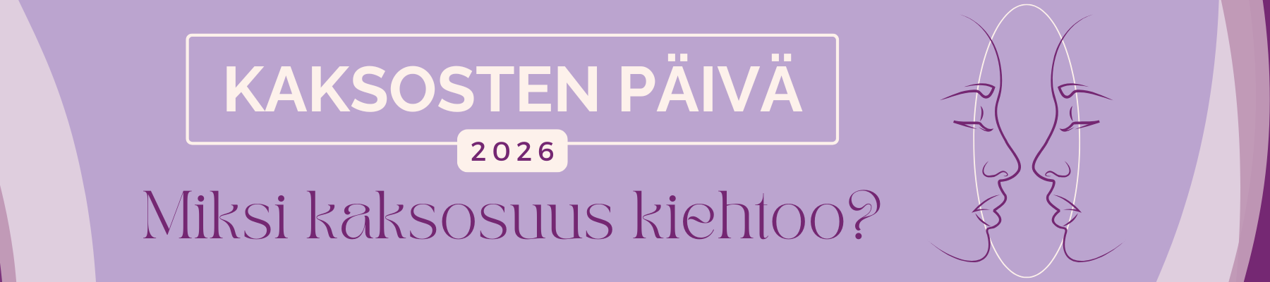 Tänä vuonna Kaksosten päivän somekampanja laajenee poikkeuksellisesti yksittäisestä teemapäivästä viiden päivän (2.–6.2.2026) mittaiseksi. Tuolloin sosiaalisen median kanavissamme sukelletaan kaksosuuden kiehtovaan maailmaan kolmen eri näkökulman kautta: