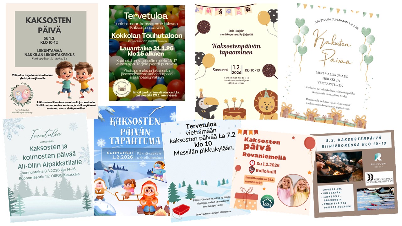 Om Tvillingdagen informerar vi på vår webbplats monikkoperheet.fi/toiminta/kaksosten-paiva och på Facebooksidan Valtakunnallinen Kaksosten päivä.