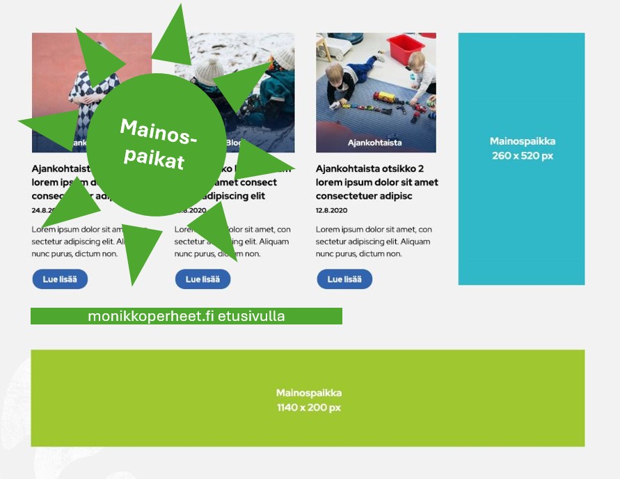Mainospaikka Monikkoperheet.fi verkkosivun etusivulla